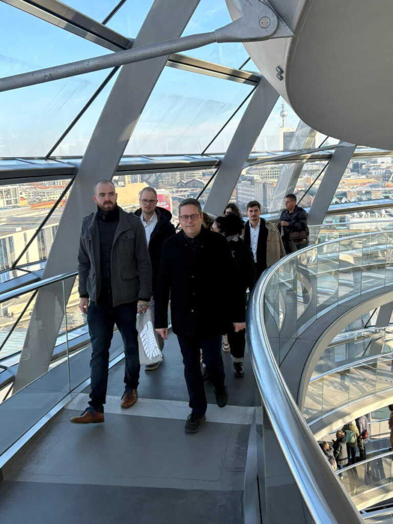 Den zweiten Tag unseres Berlin-Besuchs verbrachten wir im Bundestag. Dort hatten wir die Möglichkeit, uns mit SPD-Verkehrspolitiker Dirk Vöpel über verkehrspolitische Themen auszutauschen. Im Anschluss folgte ein Gespräch mit dem baden-württembergischen Abgeordneten und Parlamentarischem Geschäftsführer der CDU/CSU-Fraktion Steffen Bilger. Der Besuch der Reichstagskuppel rundete das Programm ab.
