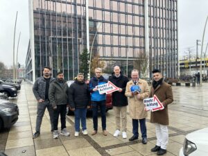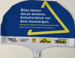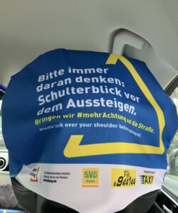 Wer kennt es nicht. Eine kurze Unachtsamkeit, eine geöffnete Beifahrertür, ein heranrauschender Fahrradfahrer und schon ist der Unfall passiert. Unter dem Motto #mehrAchtung wirbt die Taxizentrale Karlsruhe für mehr Sensibilität im Straßenverkehr. Wir tragen die Aktion gerne mit. Gesponsort wird diese durch die SVG-Baden, der wir für die Finanzierung herzlich danken. Am vergangenen Freitag wurde die Aktion in Karlsruhe bei einem Pressetermin vorgestellt. Die Stadt Karlsruhe, vor Ort vertreten durch Bürgermeister Dr. Albert Käuflein, und der Allgemeine Deutsche Fahrrad Club unterstützen dieses Vorhaben. Zusammen setzten ihre Vertreter ein Zeichen für die Wichtigkeit des Schulterblicks vor dem Aussteigen. Mit diesem wird ein Dooring-Unfall, also das Übersehen eines Fahrradfahrers beim Öffnen einer Autotür, verhindert. Deshalb rüstet die Taxizentrale Karlsruhe die angeschlossenen Taxen mit einem Überzug der Nackenstütze aus, der die Fahrgäste darauf aufmerksam machen soll.